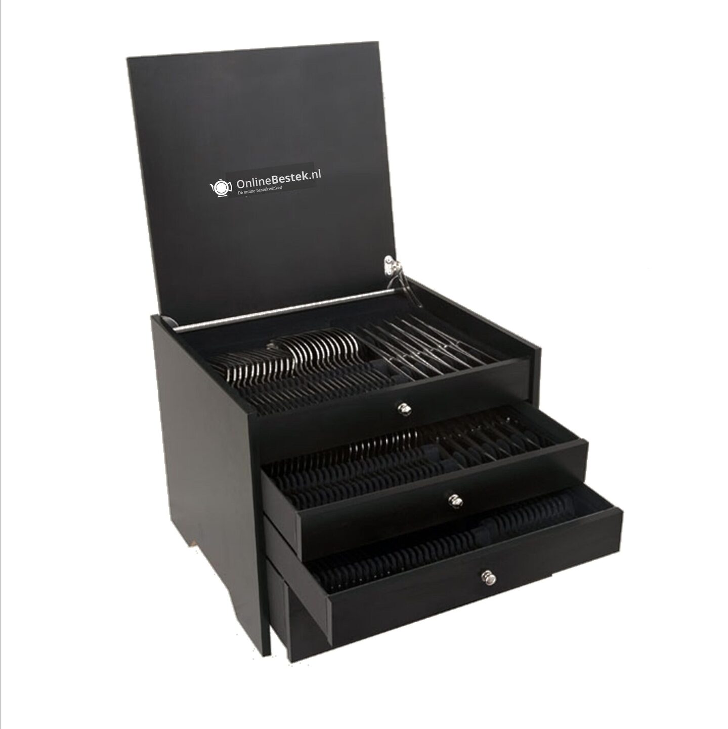 Prachtige zwart houten en gecombineerd met aan de binnenzijde kartonnen bestekkist van het merk Dalper met 3-laden en één openslaande klep, voor het compact opbergen van al uw mooie bestek. In de bestekkist is plaats voor 12 tafelcouvert 3-dlg, 12 dessertcouverts 3-dlg, 12 couvert 2-dlg, 12 taartvorken, 12 theelepels, en 10 diendelen met een totaal van 130 bestekdelen.