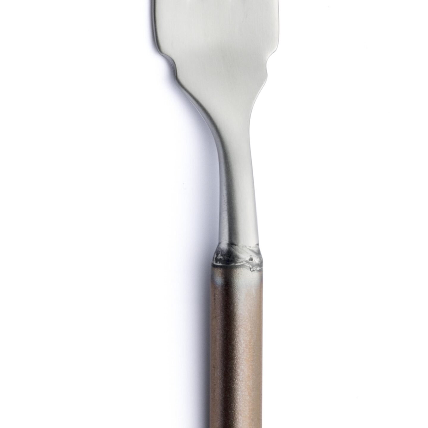 Ieder bestekdeel wordt handmatig gelast en afgewerkt tot in het kleinste detail. Puur vakwerk. Hierdoor is ook ieder bestekdeel uniek en absoluut geen massaproduct. Het gepolijste stalen heft krijgt de mooie gebrande kleur wanneer deze in de oven op hoge temperatuur wordt gebracht. Het bovenste deel van het Forged bestek is gemaakt van gesmeed staal en heeft een mat satijnen afwerking. De gelaste overgang van het lemmet naar het heft maakt dit Forged industriële bestekontwerp helemaal af.