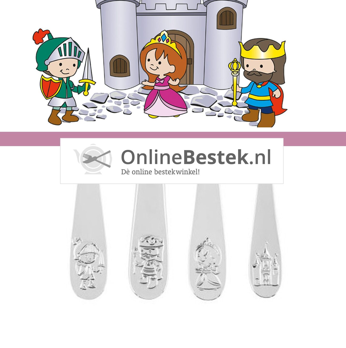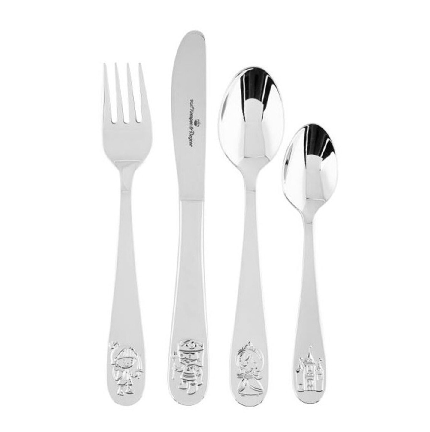 Maak van eten een feest met het Van Kempen & Begeer Princess kinderbestek! Dit 4-delige setje is gemaakt van hoogwaardig 18/10 edelstaal en is volledig vaatwasmachinebestendig. Op elk onderdeel schittert een ander figuur: ridder Lancelot op de vork, de koning op het mes, de prinses op de lepel en het kasteel op het kleine lepeltje. Een betoverend ontwerp voor elke stoere ridder of prinses aan tafel!