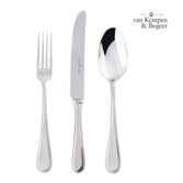 Het van Kempen & Begeer Perlé bestek vindt haar oorsprong in de handen van de Hollandse zilversmeden in de loop van de 18e eeuw. Een nieuw en subtiel stijlelement wordt aan de eenvoudige en nuchtere hoofdvorm van het reeds vermaarde Hollandse gladde bestek toegevoegd. Perlé - Een verfijnde rand van zilveren bolletjes op de zijkant van de stelen versiert als ‘glinsterende parels’ de randen van dit bestek.