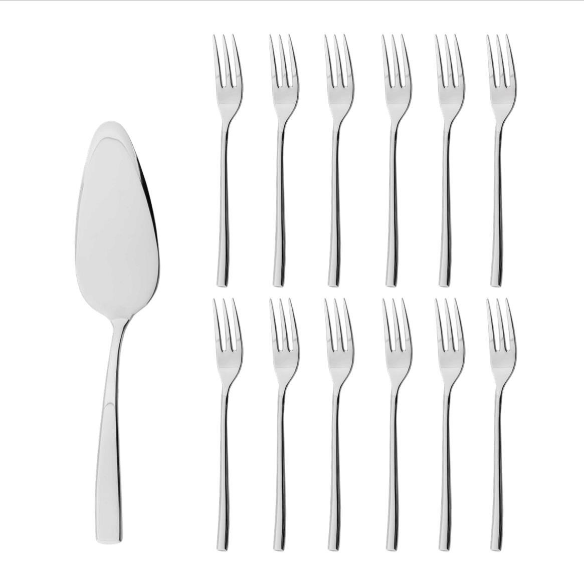 Dit SR-design Bologna gebakset is een 13-delige set geschikt voor een tafel van 12 personen. De exclusieve Italiaanse design bestekcollectie van SR waarin kwaliteit en design gecombineerd worden met elegant en functioneel. De modern vormgegeven Bologna-bestekset heeft een fraai design gekenmerkt door lange strakke lijnen. Dit sierlijk en elegant afgewerkte bestek Bologna is gemaakt van 4 mm dik RVS 18/10 hoogglans gepolijst edelstaal en is daardoor duurzaam, onderhoudsarm en vaatwasmachinebestendig. SR-design geeft op dit bestek dan ook 10 jaar garantie!
