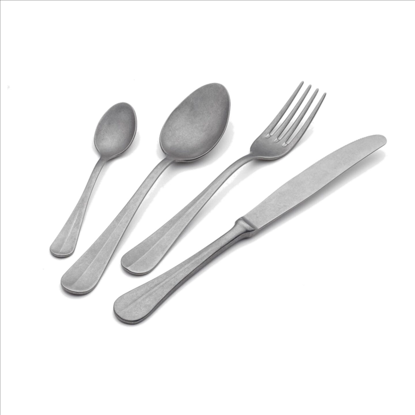 Deze Napels 24-delige bestekset is geschikt voor een tafel van 6 personen en geeft je dinertafel een uniek en eigentijdse uitstraling. De klassieke en robuste bestekserie is in retro-stijl uitgevoerd, de matte en oud gemaakte afwerking zorgen niet alleen voor een luxueuze, maar ook een unieke uitstraling. Dit bestek past perfect in zowel een stoere industriële setting als in een landelijk decor. Het Napels bestek is gemaakt uit bewerkt en oudgemaakt roestvrij 18-10 edelstaal.