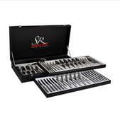 Het SR-design Roma bestek kenmerkt zich door de speciale messen. Deze bestaan uit één deel en worden daarom een zogeheten “monoblock” messen genoemd. Het mes wordt vervaardigd uit speciaal messen-staal, waar van het lemmet op hoge temperatuur verhard is. U bent dus verzekerd van een scherp en goed snijdend mes. SR-design Roma mes voelt stevig en zwaar aan, waardoor het lekker en comfortabel vasthoudt.
