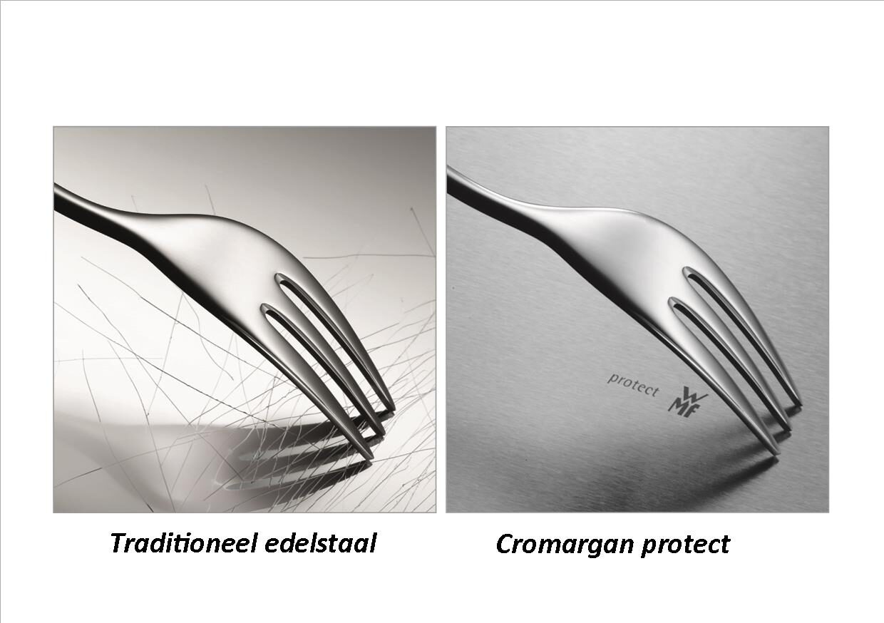 Cromargan protect® – een schitterende innovatie, internationaal gepatenteerd en alleen van WMF. Bij normale bestekken waren er bij het testen al na een paar test runs duidelijke sporen en diepe krassen te zien. Het oppervlak van bestekken van Cromargan protect® bleef echter ook bij lange test runs bijna onberispelijk. De voordelen van Cromargan protect: Krasbestendig - extreem bestand tegen alle soorten gebruikssporen - gepolijste oppervlakken blijven glanzen, matte oppervlakken blijven mat - roestvrij en geschikt voor de vaatwasmachine - internationaal gepatenteerd, alleen bij WMF - alle eigenschappen van het mooie WMF Ambiente Cromargan protect® gegarandeerd.