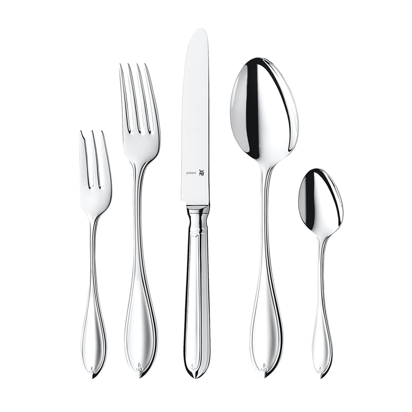 Cromargan protect® – een schitterende innovatie, internationaal gepatenteerd en alleen van WMF. Bij normale bestekken waren er bij het testen al na een paar testruns duidelijke sporen en diepe krassen te zien. Het oppervlak van bestekken van Cromargan protect® bleef echter ook bij lange test runs bijna onberispelijk. De voordelen van Cromargan protect: Krasbestendig - extreem bestand tegen alle soorten gebruikssporen - gepolijste oppervlakken blijven glanzen, matte oppervlakken blijven mat - roestvrij en geschikt voor de vaatwasmachine - internationaal gepatenteerd, alleen bij WMF - alle eigenschappen van het mooie WMF Premiere Cromargan protect® gegarandeerd.