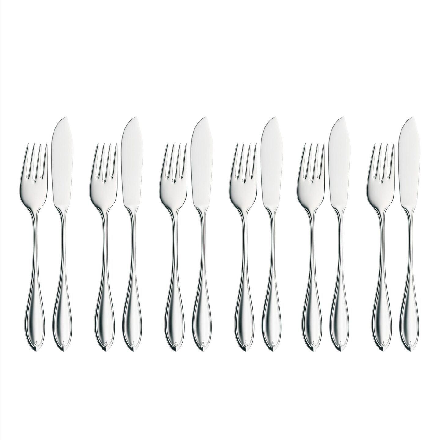 WMF Premiere 12 delig visbestekset geschikt voor een tafel van 6 personen. Van dit bestek is vormgeving geïnspireerd door klassieke lijnen. De verhoudingen van dit WMF Premiere bestek set zijn ideaal gekozen en liggen perfect in de hand, het bladmotief op de voorkant van het bestek wordt herhaald op de achterkant en is terug te vinden op tot op het kleinste deel van het bestek. Dit maakt de Premiere tot een tijdloze klassieker en getuigt ook nog eens van hoge kwaliteit en de vakmanschap die het Duitse merk WMF in huis heeft.