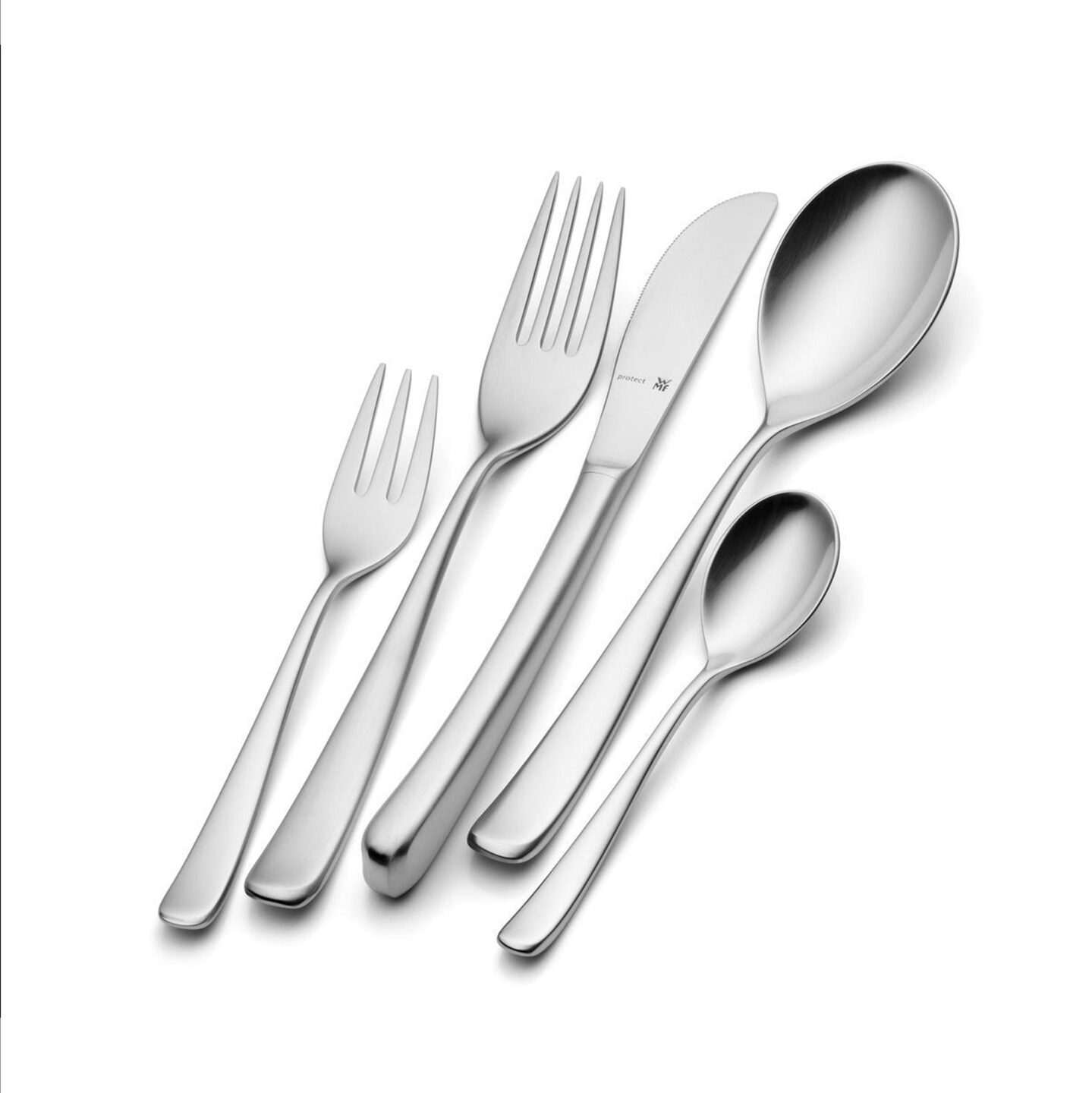 WMF Vision Protect 66 delig is geschikt voor een uitgebreide tafel van 12 personen. Dit mooie Vision protect bestek van het merk WMF heeft een bijzonder en opvallend design. Het kenmerkt zich door de ongebruikelijke lengte en het mes dat gekanteld neergezet kan worden. Bovendien voelt dit bestekset massief aan dankzij het gebruikte materiaal. De WMF Vison protect bestekset is vaatwasmachine bestendig.